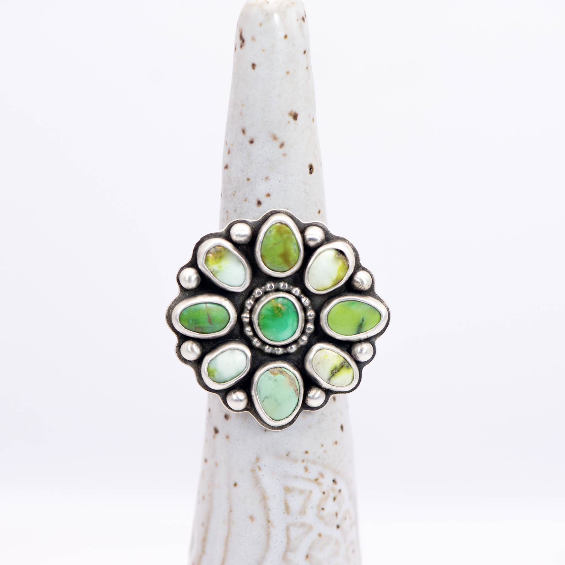 A radiant mix of Verde Valley Turquoise, Emerald Valley Turquoise, and Palomino Variscite bloom together in this soulful nine-stone statement ring.
