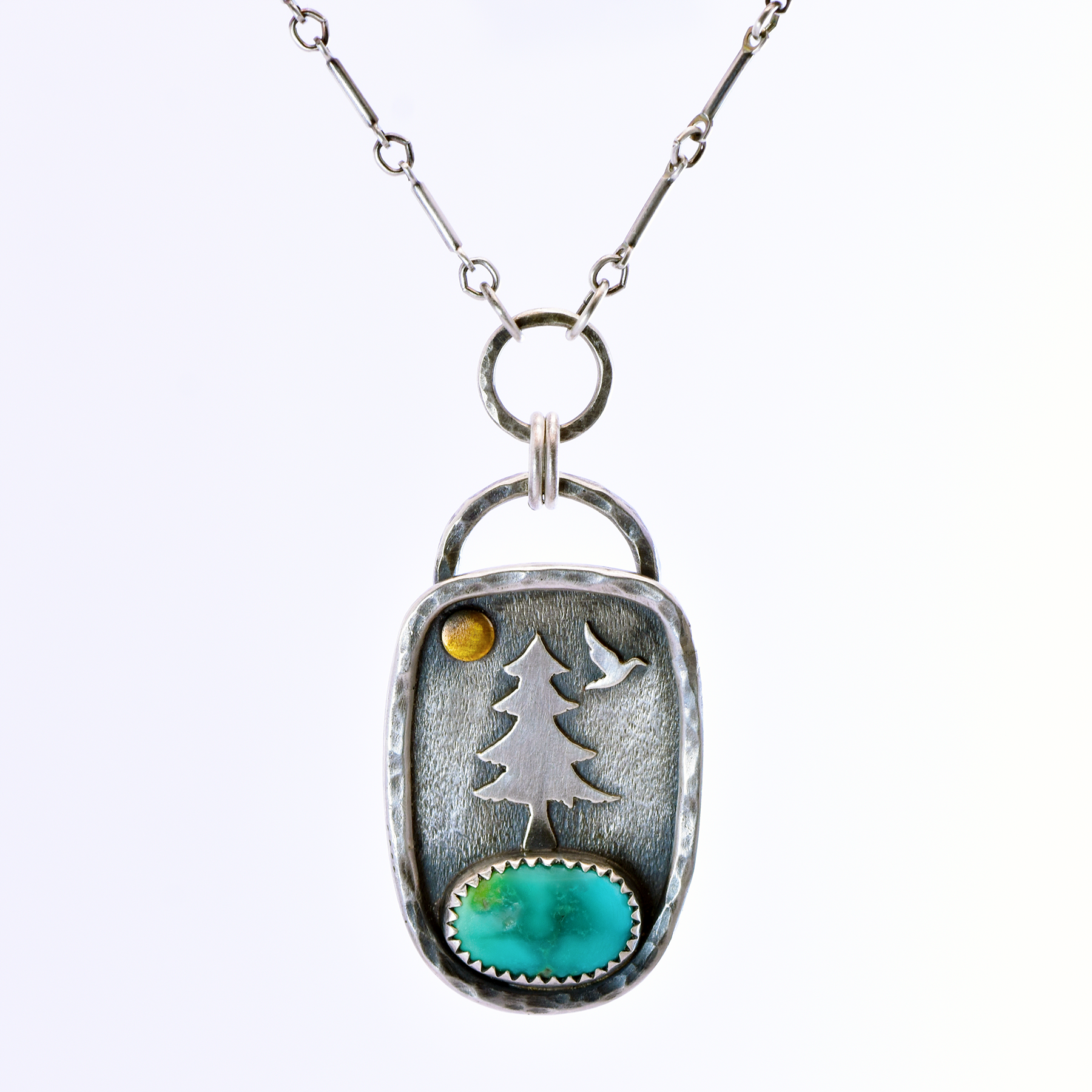 Hand-forged in sterling and fine silver, The Moonlight Flight features a deep blue-green Emerald Valley turquoise — a stone reminiscent of forest shadows meeting ocean light. A warm copper moon rises above a hand-sawn pine tree and tiny bird in flight, each detail shaped and finished by hand.